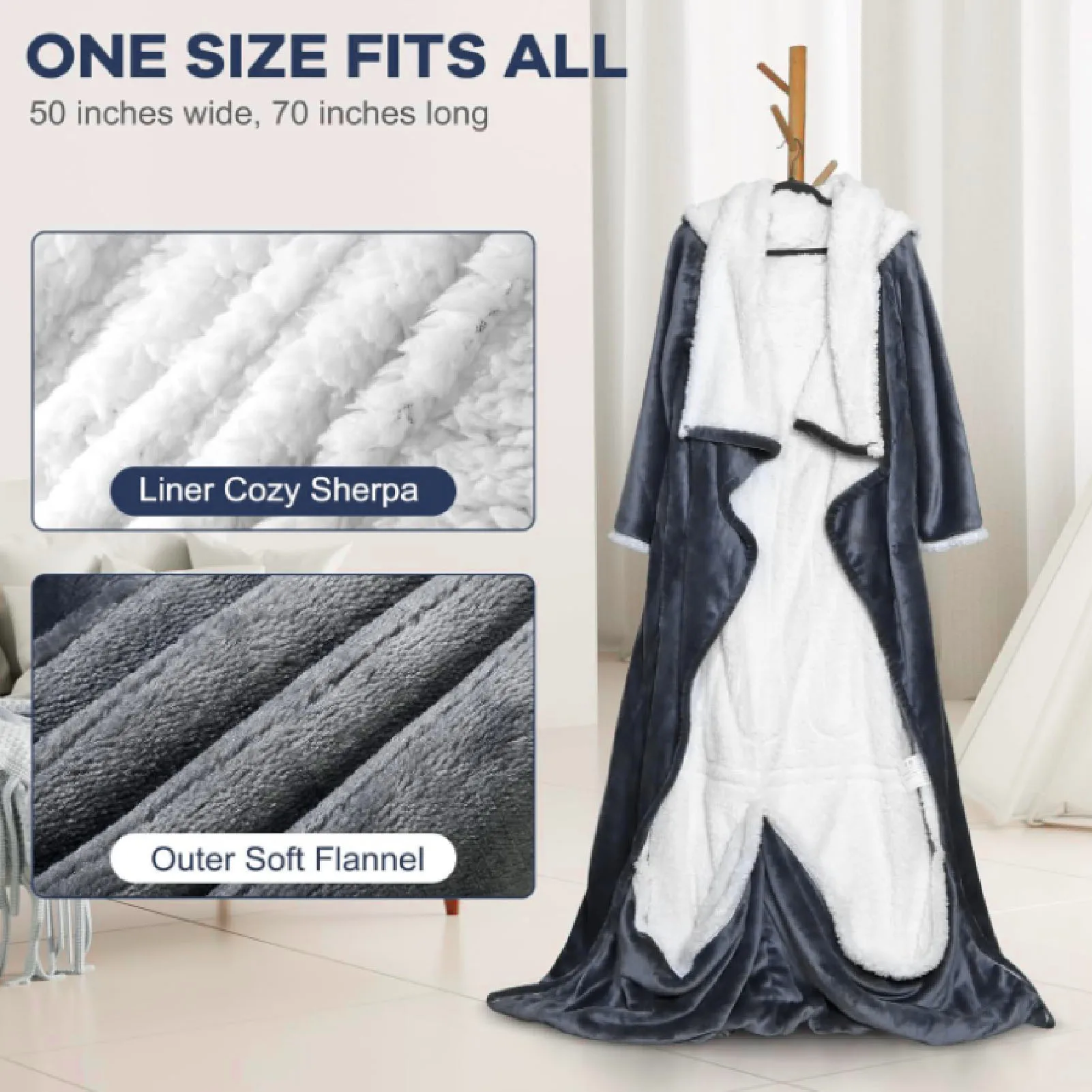 50x70in Heated Blanket with Sleeves Hood and Foot Pocket Flannel 10 Levels Electric Wearable Blanket with 3 Time Settings 110V