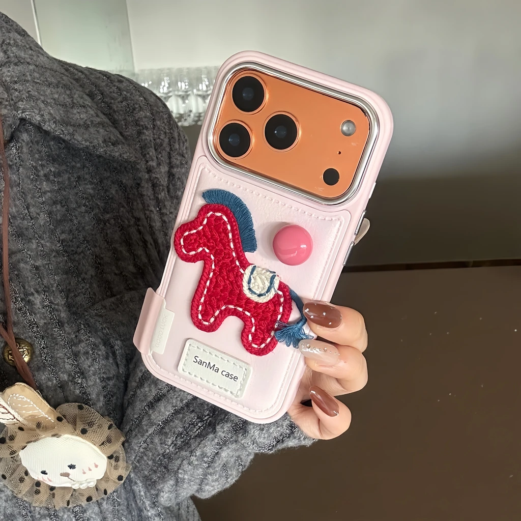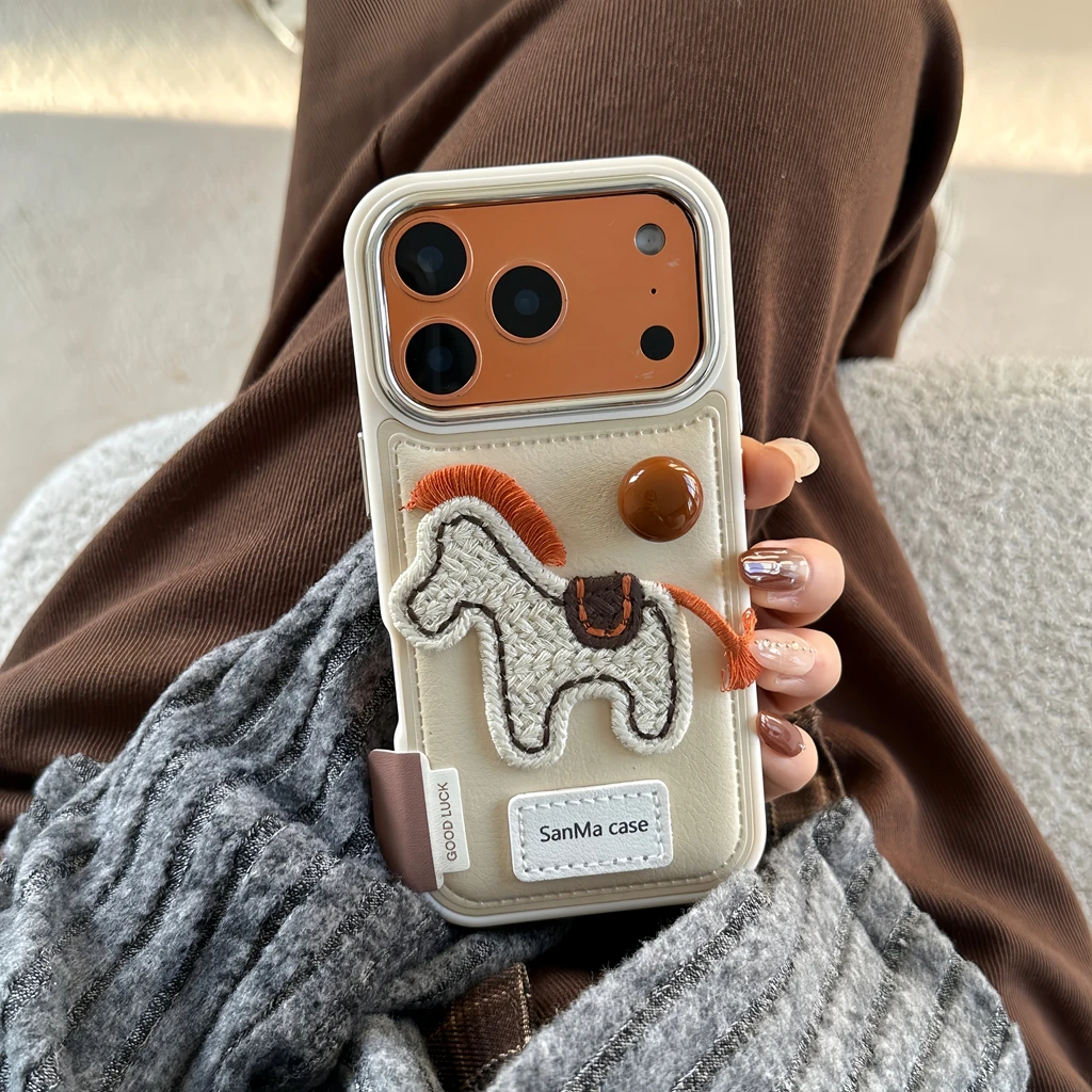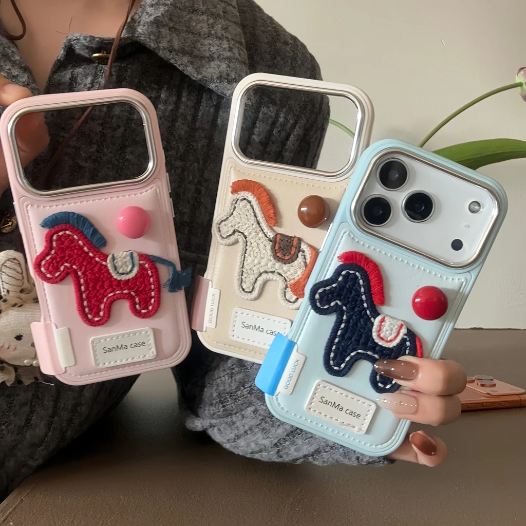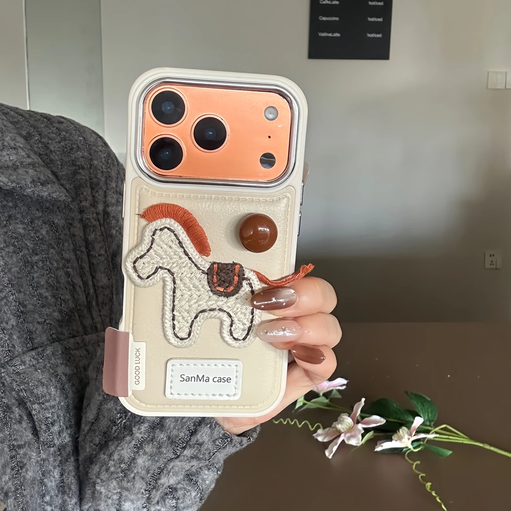 Fun Cute Stereoscopic Embroidered Horse Colored Beads Artificial Leather Phone Cover Case for iPhone 17 16 15 14 Pro Max