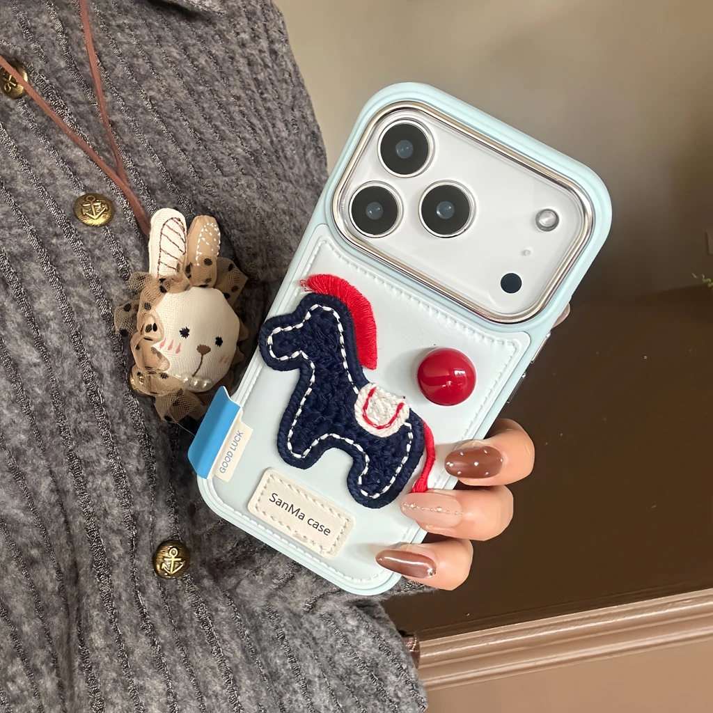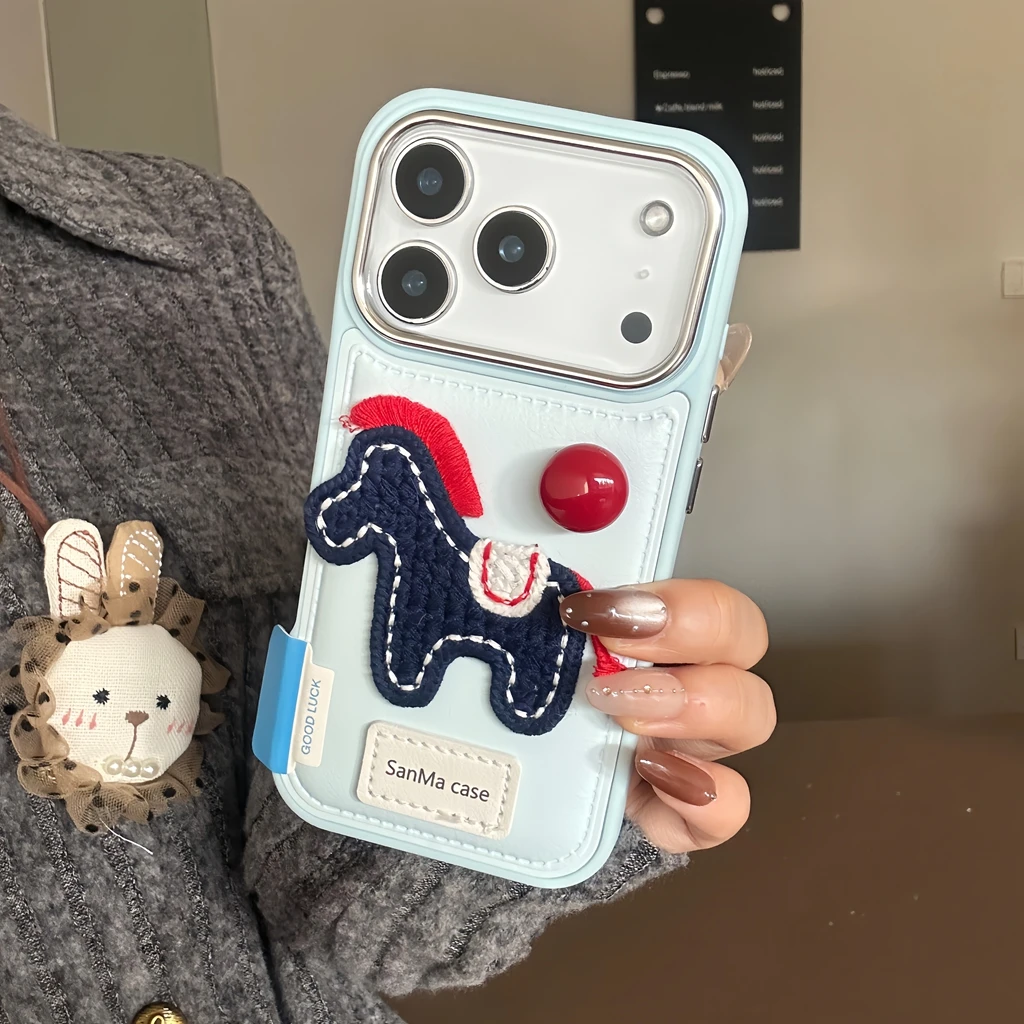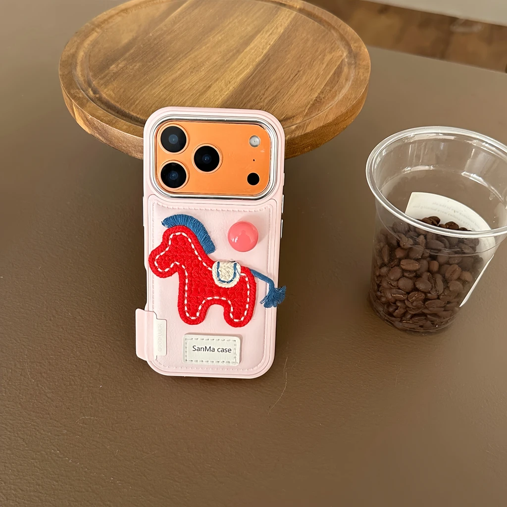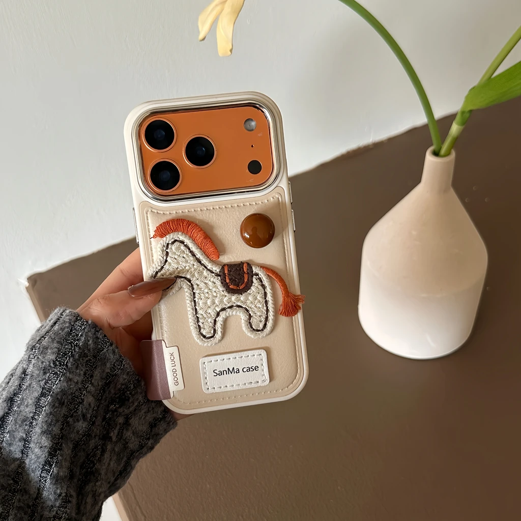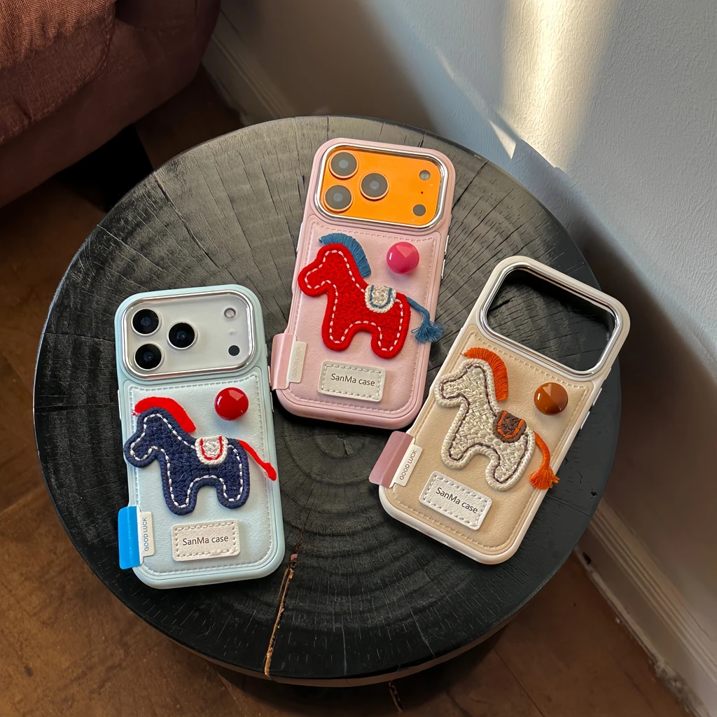 Fun Cute Stereoscopic Embroidered Horse Colored Beads Artificial Leather Phone Cover Case for iPhone 17 16 15 14 Pro Max